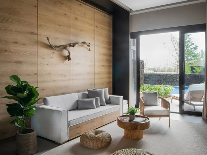 星級酒店 該項目位于景色宜人的著名旅游城市“三亞”。該項目重點工程三亞海棠灣陽光壹酒店1 Hotels以自然及可持續(xù)發(fā)展為本,擁有294間面積達62至1,300平方米的客房、套房及復式別墅?;貧w自然、簡約原始的設計風格,巧妙搭配多種未經拋光的當?shù)靥烊皇暮湍静?,打造渾厚多元的紋理及細膩和諧的配色,輔以原木打造的凳子、書桌、藤編地毯、融進自然的定制藝術品以及有機棉裝飾等,純粹而時尚。