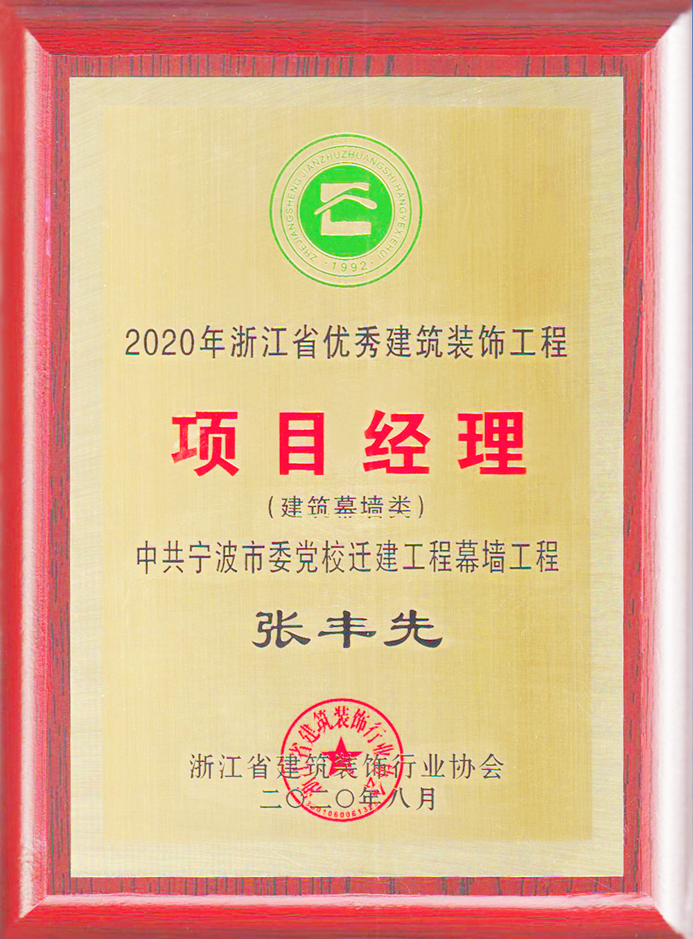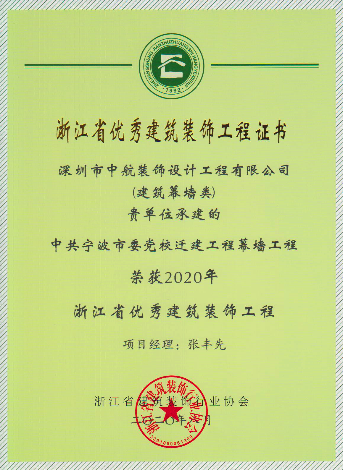 近日,浙江省建筑裝飾行業協會公布了“2020年浙江省優秀建筑裝飾工程獎(建筑幕墻類)”評選結果,中航裝飾集團承建的中共寧波市委黨校遷建工程榜上有名,項目經理張豐先亦榮獲“優秀項目經理”榮譽稱號。
