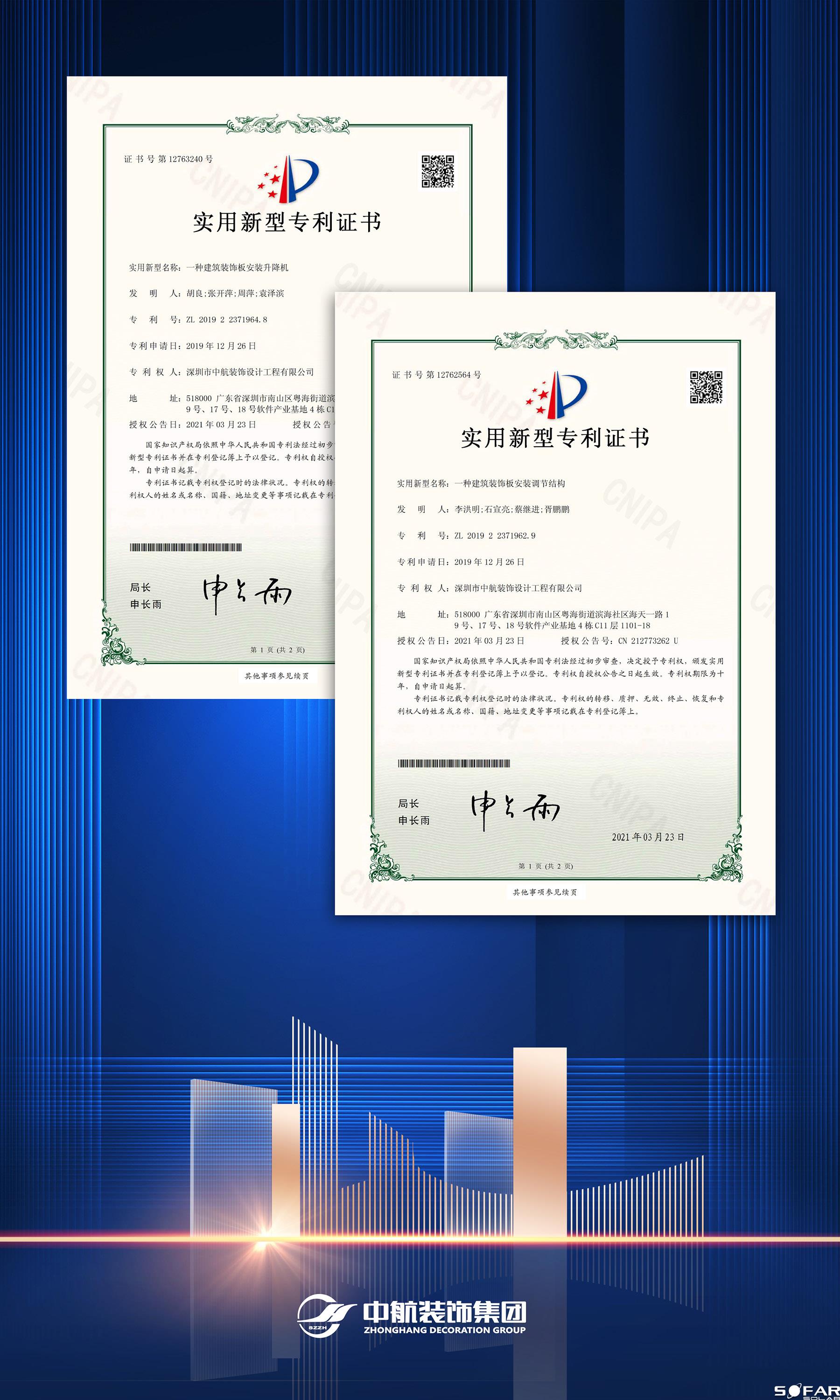 ? ? ? ?近日,中航裝飾集團(tuán)申報(bào)的“一種建筑裝飾板安裝升降機(jī)”、“一種建筑裝飾板安裝調(diào)節(jié)結(jié)構(gòu)”喜獲國(guó)家知識(shí)產(chǎn)權(quán)局頒發(fā)的實(shí)用新型專利證書(shū),為公司的科技創(chuàng)新之路再添精彩一筆。這也是中航裝飾獲得國(guó)家高新技術(shù)企業(yè)認(rèn)證后,不斷通過(guò)技術(shù)創(chuàng)新全面提升企業(yè)核心競(jìng)爭(zhēng)能力的重要體現(xiàn)。
