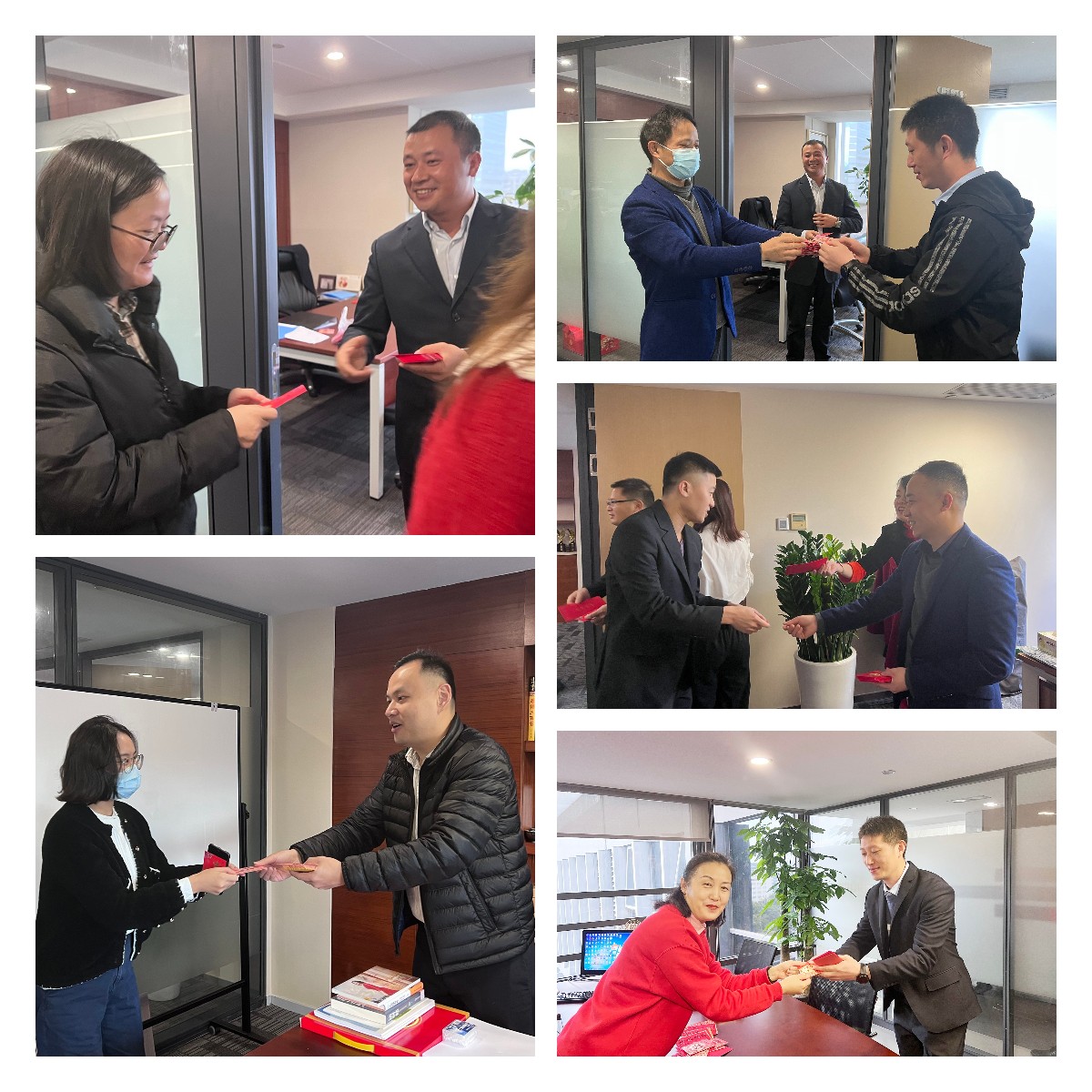 ? ? ? ?派發(fā)新年開(kāi)工利是是中航科建多年的傳統(tǒng),伴著聲聲祝福,中航科建石英董事長(zhǎng)親自為總部的每位員工派發(fā)開(kāi)工利是,每個(gè)人的臉上都洋溢著喜悅的笑容。火紅的紅包代表著公司向員工送去祝福和希冀,同時(shí)寓意新的一年紅紅火火,虎躍新程。