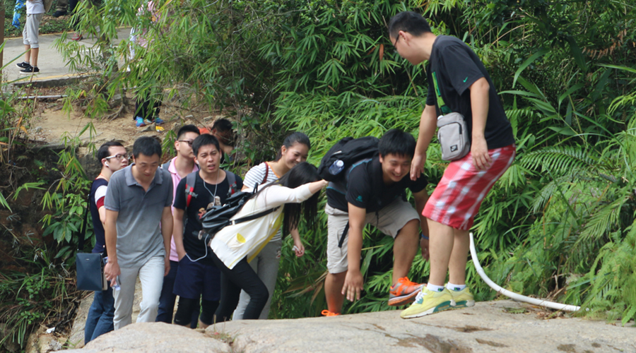 我們的探險之旅始于山底溪谷,沿溪流溯溪而上,這條線路是登馬巒山所有線路中最險要的一條。馬巒山山谷全以石為底,犬牙交錯,落差毗連,溪流迂回曲折,沿著溪谷爬行,一路攀巖附壁,入洞涉溪,驚險又浪漫刺激。艱險的路程絲毫沒有阻擋中航人迎難而上的決心和勇氣,穿草叢、攀巖石、過溪流、走峽谷,行進的旗幟在山谷獵獵飄揚。在登山的過程中,很多同事自告奮勇地積極承擔起“拉手”的角色,一路上幫扶其他同事,在最前面和最危險的地方伸出他們熱情的雙手,及時的拉一把、幫一把,讓團隊里的每一個人都成功地通過難關、險關,最終在體驗中成功的登上了馬巒山山頂。