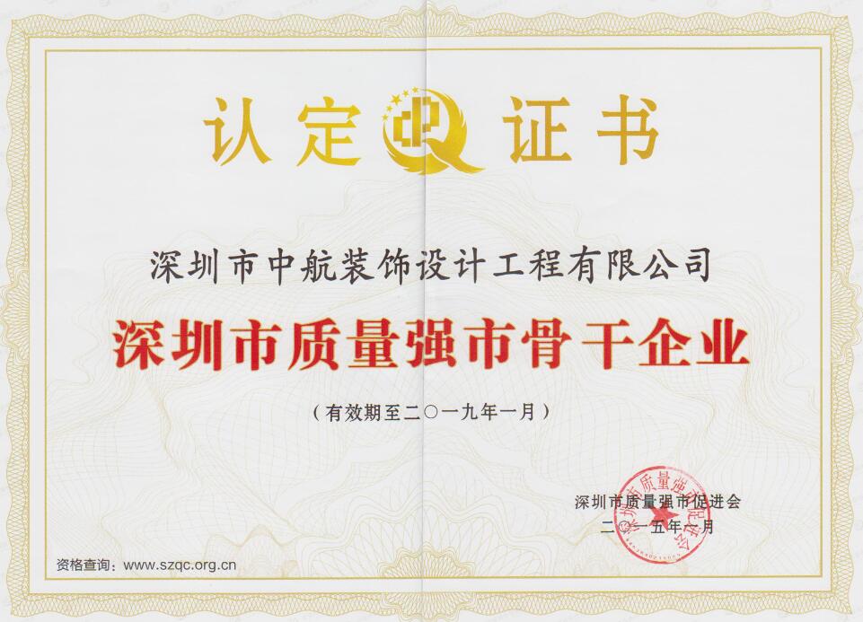 中航裝飾作為深圳市質量促進會的會員單位,于2015年獲得深圳市質量強市骨干企業,2016年深圳質量百強企業。一直遵循“視質量為生命,重責任于泰山”的經營方針,重質量、講誠信、樹品牌,中航裝飾的發展也一直體現著靠質量贏得市場,以遠見成就發展的宗旨。